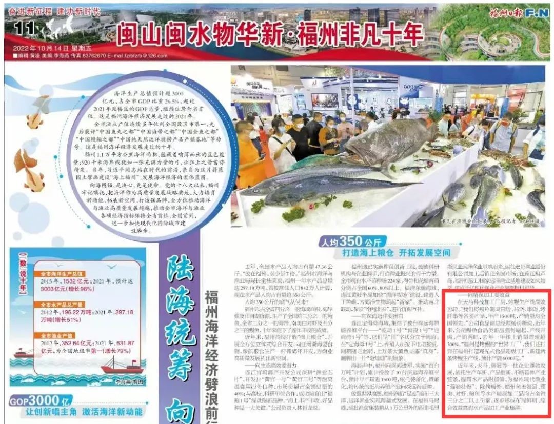 天馬科技訊 10月14日,福州日報(bào)刊登專版報(bào)道《閩山閩水物華新 福州非凡十年》,報(bào)道了天馬科技集團(tuán)布局鰻魚食品全產(chǎn)業(yè)鏈,以高品質(zhì)預(yù)制菜向精深加工要效益,引領(lǐng)國鰻崛起,引發(fā)了社會的廣泛關(guān)注。報(bào)道如下↓↓↓